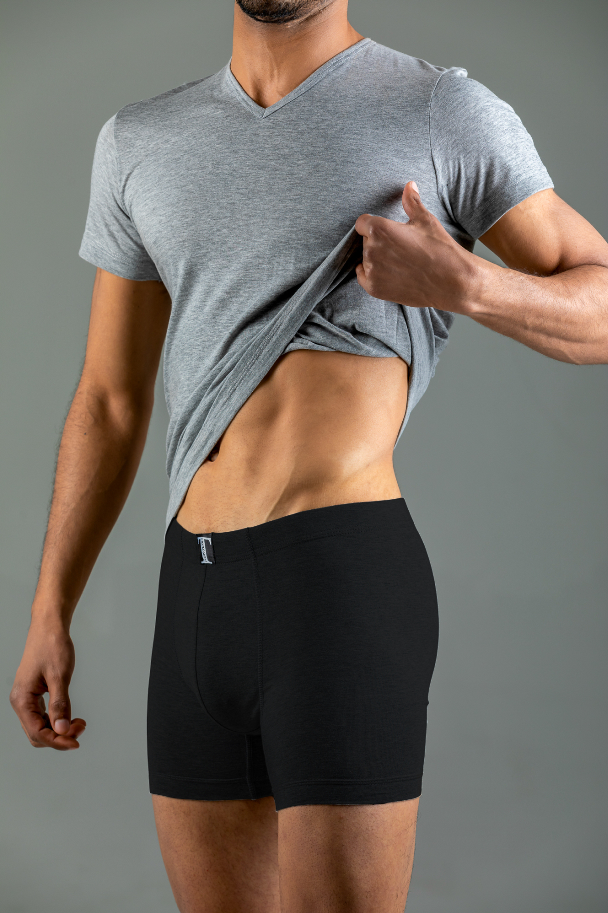 Close-up of a men's Balck cotton-blend underwear and t-shirt set, showing fabric texture and fit